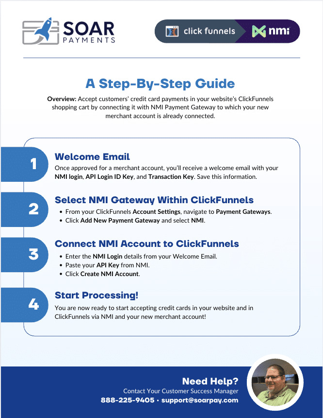 Follow these simple steps to connect your SoarPay high risk merchant account to your ClickFunnels shopping cart using NMI. This setup allows you to securely accept customers’ credit card payments and start processing immediately.