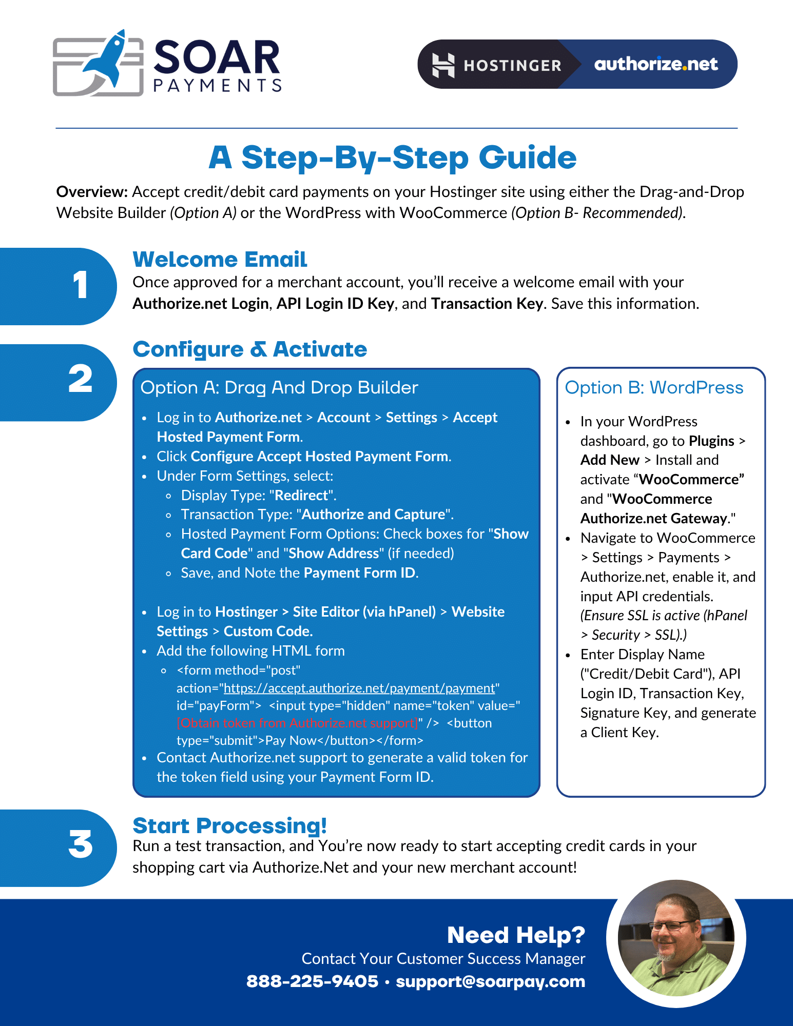 Overview: Follow these simple steps to connect your SoarPay high risk merchant account to your Hostinger site using either the Drag-and-Drop Website Builder (Option A) or WordPress with WooCommerce (Option B – Recommended) via Authorize.net. This setup allows you to securely accept customers’ credit/debit card payments and start processing immediately.